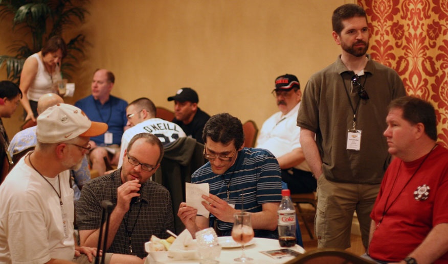 Once again, BARGE enjoyed the hospitality of our good friends at Binion’s. And, again, the banquet was held at the Golden Nugget where Tom Schneider spoke. While the team CHORSE even took place at the Nugget, the other tournament events took place at Binion’s. The NL hold’em tournament was won by Dan Chevrie. Mark "Dagon" Rafn came in second, and Steve "Lunchbox" Forcash finished third. The Tuesday event was the sadistic no-limit hold’em shootout transitioning to limit HORSE. This event was won by Guy "Grizz" Berentsen. In second was Chris "Jepstonian" Jepsen. Bob Ogus finished in third place. Matt "Grapes" Grapenthein won the blackjack event and Chic Natkins won the video poker tournament. In the Zimmers Memorial Lowball event, Richard "Quiet Lion" Brodie took first place. He was followed by Chris "Tom Bayes" Mecklin in second and Ken "ADB QB" Kubey in third. Through means nobody quite understands, Team Moosecock won the Team CHORSE event (even though there where, what, only two real Canadians on the team?). Steve "BIA" Nissman won the stud shootout followed by Stephen "Marlin" Cohen and Greg Pappas. Barry Tanenbaum emerged victorious in the ToC-style event. Marc "The Occupant" Gilutin came in second and Chuck Weinstock was third. This was Chuck Weinstock’s last BARGE as organizer, although he continues as honored organizer emeritus. This was also Nick Christenson’s first BARGE as an organizer.