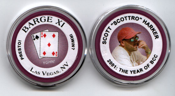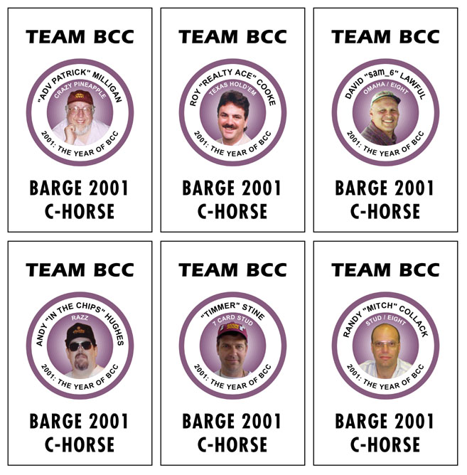 In March 2001, the Barge Chip Committee was formed. It appeared that the BARGE 2000 NLHE champion was unlikely to participate in the creation of BARGE chips, so a group of RGPers took the reigns and formed the BCC. The founding members were Randy Collack, Scott Harker, Andy Hughes, David Lawful, Patrick Milligan, Tom Sims and Paul Stine.