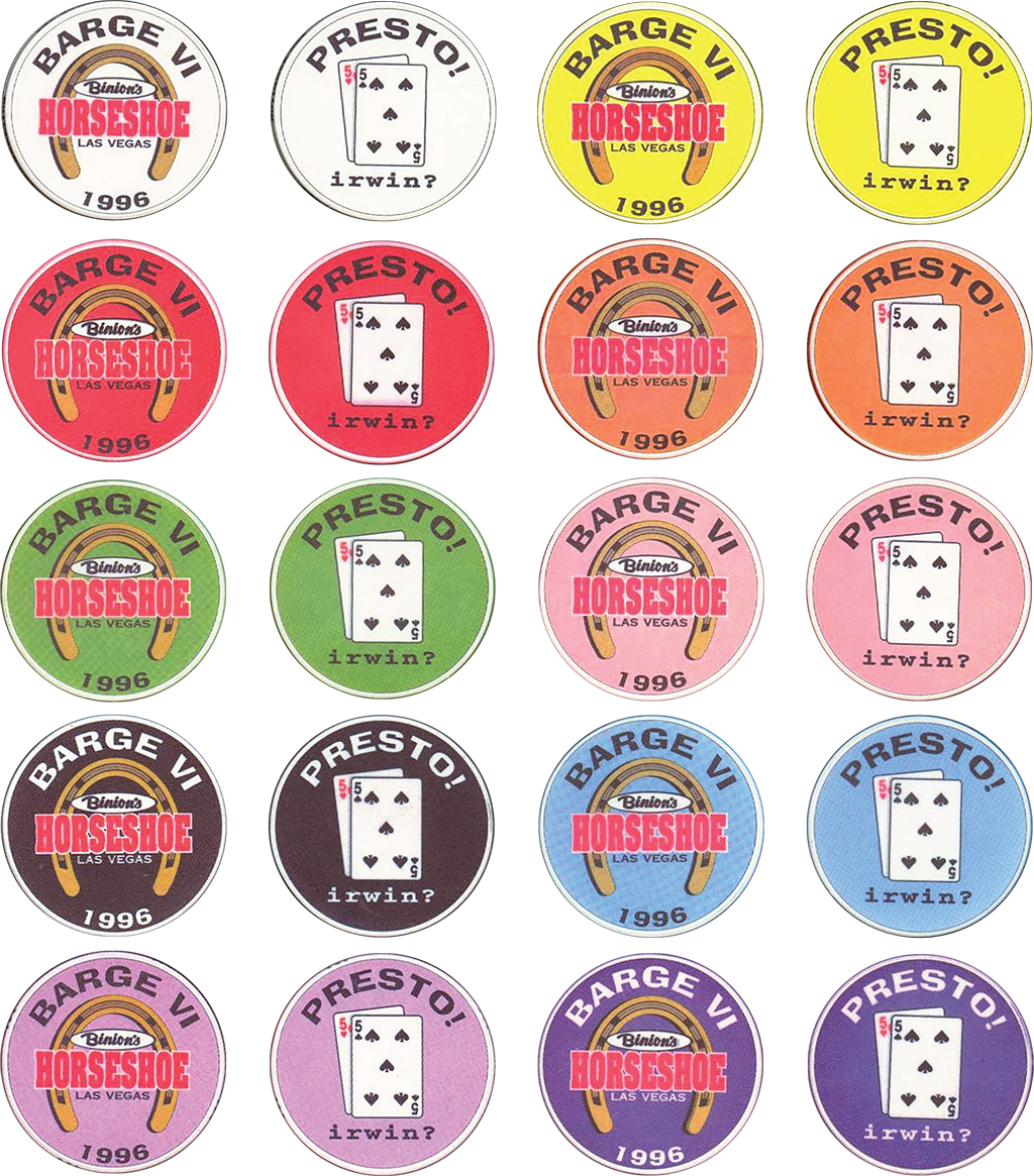 This set was designed by 1995 NLHE champ Tom Sims. A 300 chip home set of these chips was presented to the 1996 BARGE NLHE Champ, Mike Zimmers.