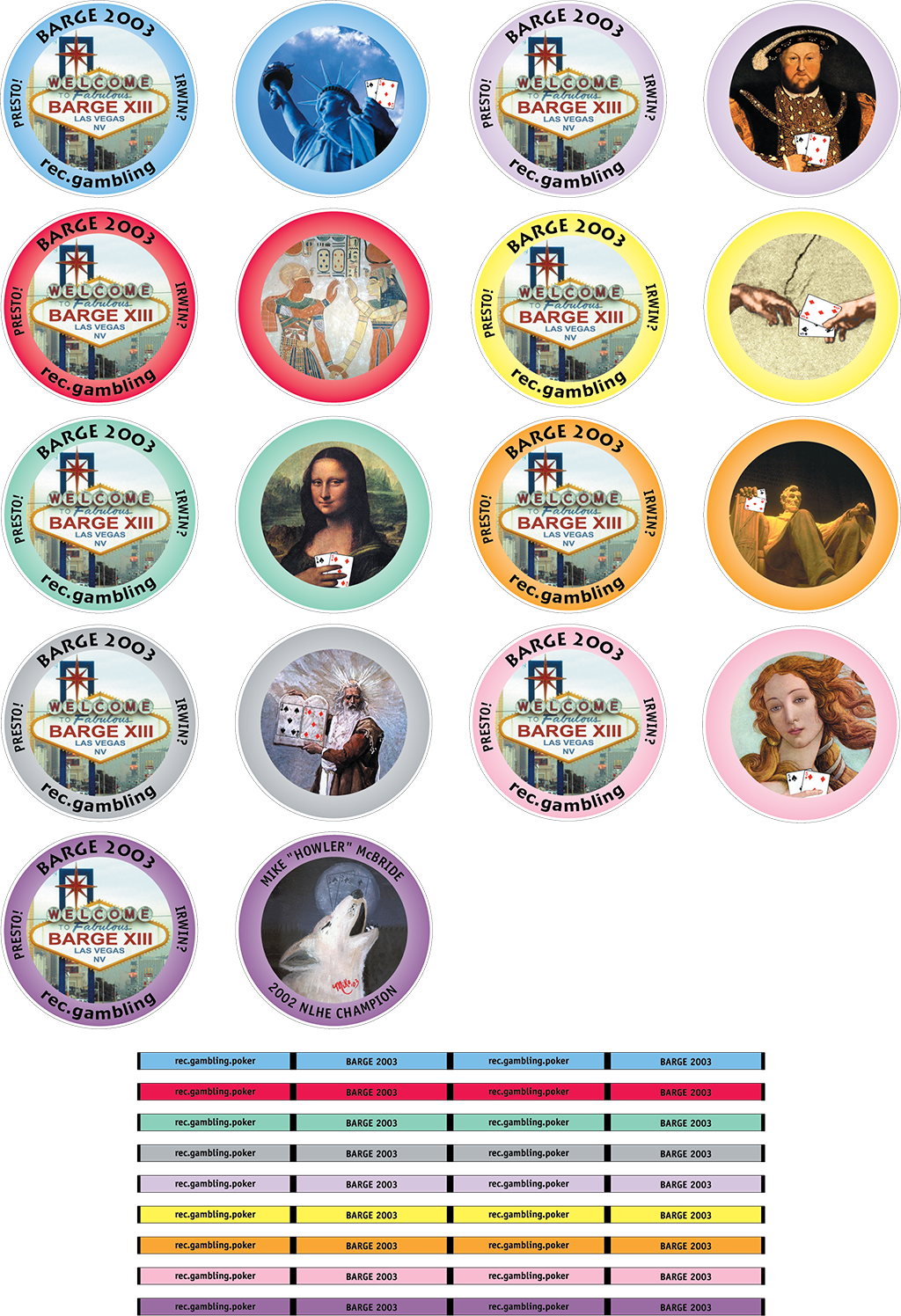 These chips were created by BARGE 2002 NLHE Champion Mike “Howler” McBride, with the graphic design help of Patrick Milligan and the support and feedback of the BARGE Chip Committee.