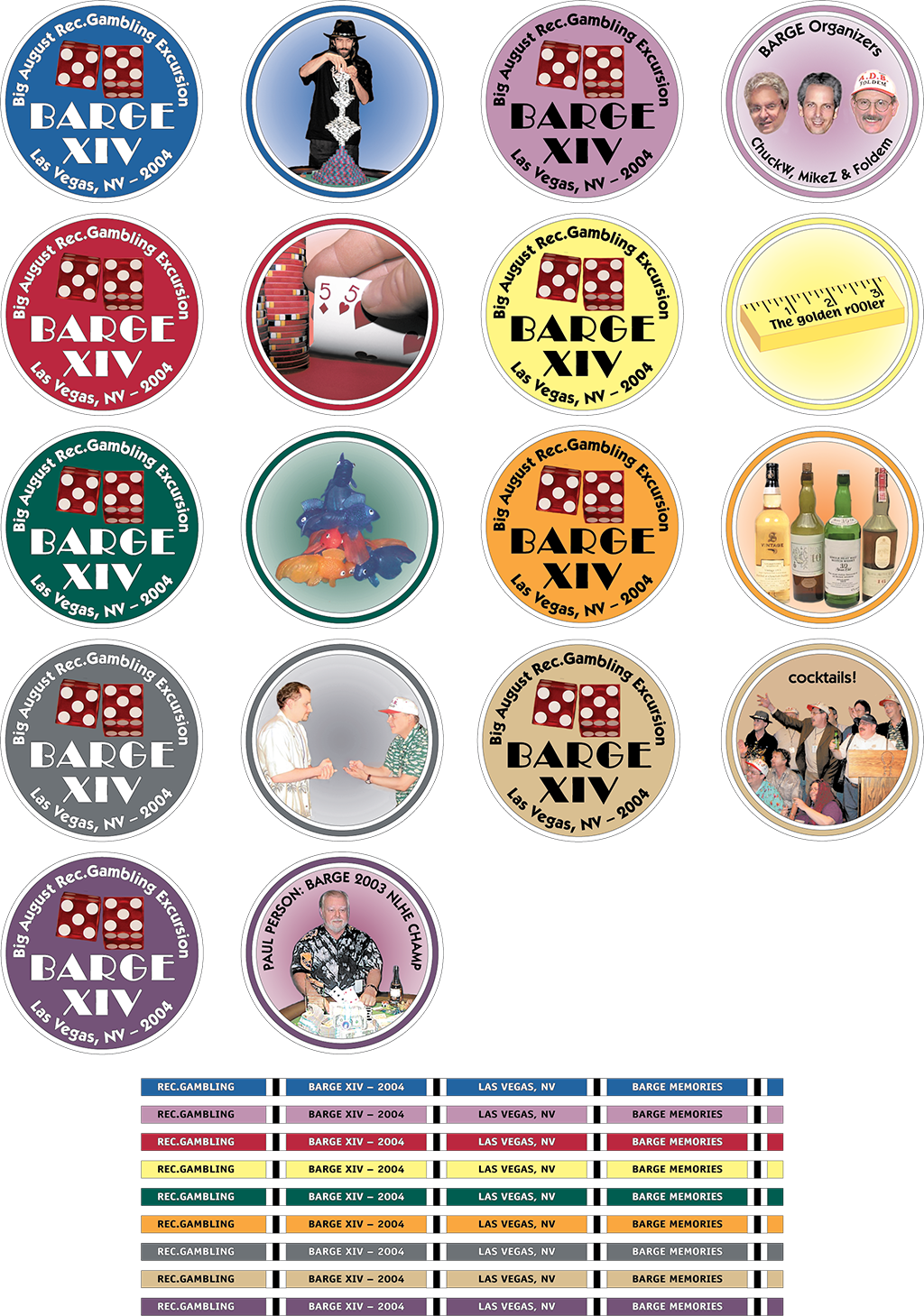 This year, the theme is BARGE Memories. Each chip in the chip set has a common obverse (BARGE XIV and dice) with a different BARGE memory for each face. Standard chip colors are used.
