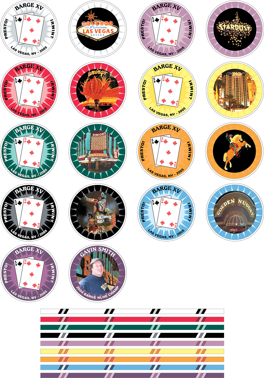 This year, the theme is Las Vegas Neon. Each chip in the chip set has a common obverse (BARGE XV and the Canadian or Maple Leaf Presto!) with a different Las Vegas neon sign for each face. Standard chip colors are used.
