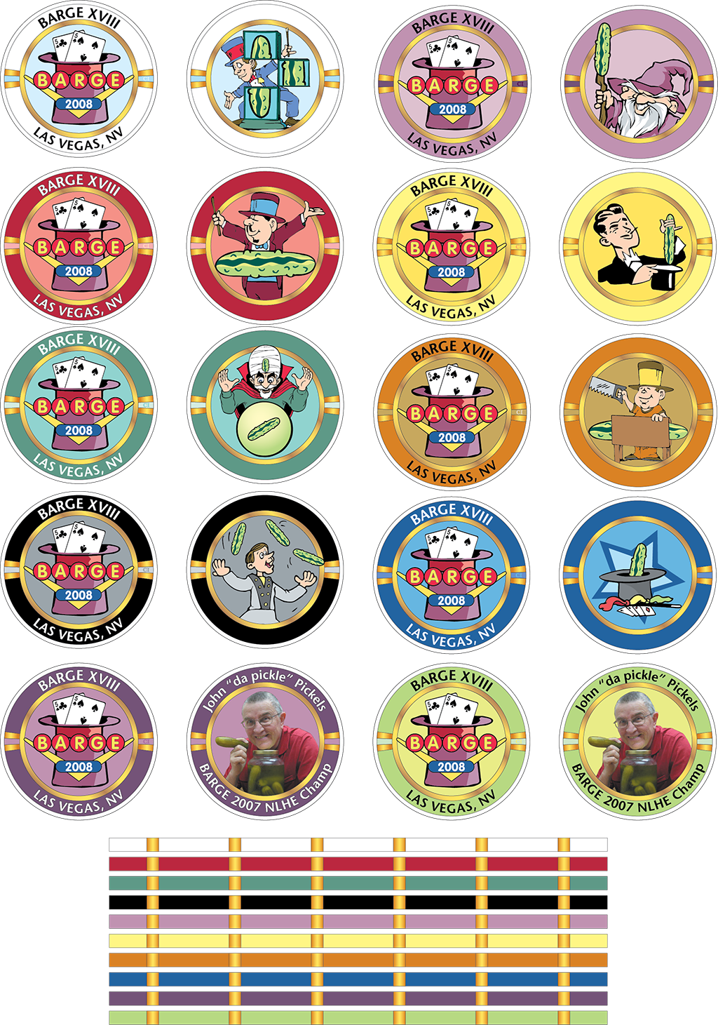 This year, the theme is “Pickle Magic.” Each chip in the chip set has a common obverse with a different image of some form of “Pickle Magic” for each face. Standard chip colors are used.