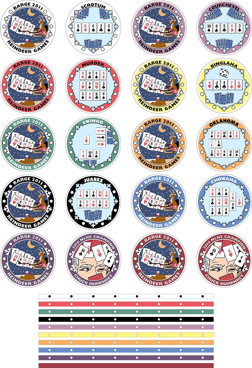 This year, the theme is “Reindeer Games.” Each chip in the chip set has a common obverse showing a reindeer in a sleigh being pulled by a set of cards. Standard chip colors are used. The BARGE 2010 NLHE Champion, Chuck Humphrey, came up with the theme.