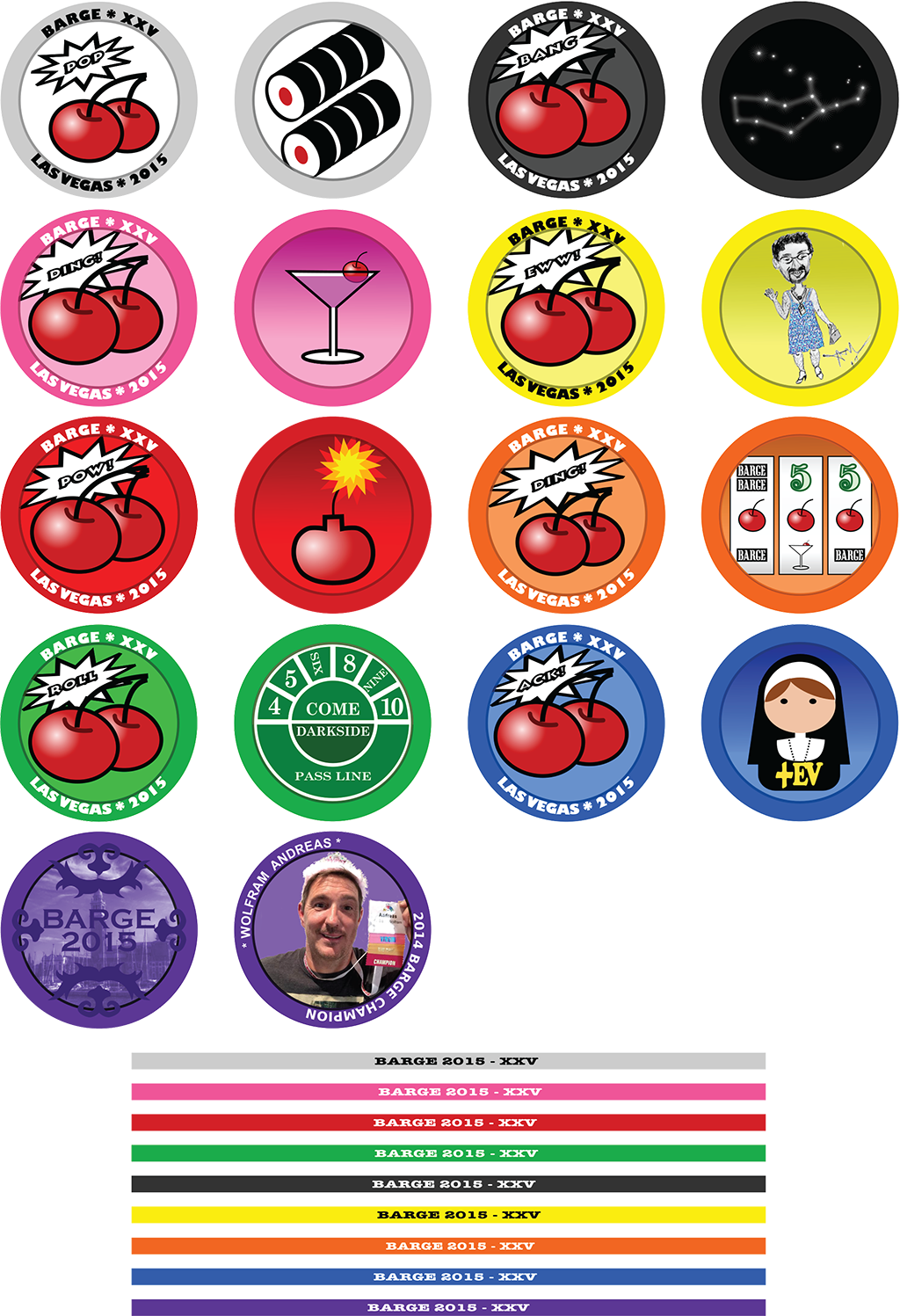 In everyone’s life there is a first time. The 2014 BARGE Main Event winner, Andreas “Andy” Wolfram, was inspired by his first time in Las Vegas and made the BARGE Virgin Experience his 2015 BARGE Chip Collection theme. Ron invited Andy to BARGE. Artist Mike McBride captured the iconic moment featuring Ron in a dress ensuring Ron remains a virgin forever at least in Andy’s mind. Andy had a fabulous sushi dinner represented by the tuna roll chip. Other fun virgin activities include playing the Sex in the City slots with a group of traveling positive EV nuns who were staying at the Queens, drinking Shirley Temple’s while other players were downing shots of tequila, trying to find the Virgo constellation while under the laser show in downtown Vegas, and finally losing his shirt while on the very funny craps tour across multiple casinos. We invite you to share Andy’s BARGE Virgin Experience by purchasing your own sampler set of the 2015 BARGE Chip Collection.