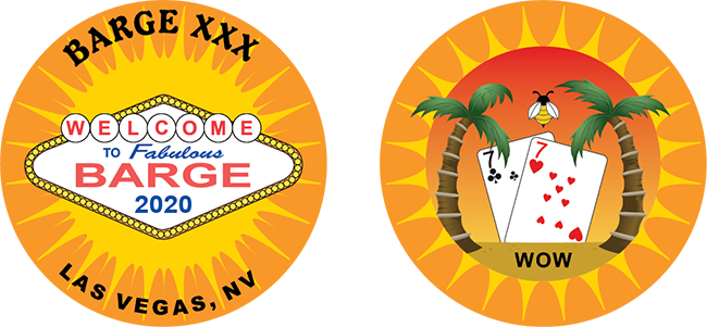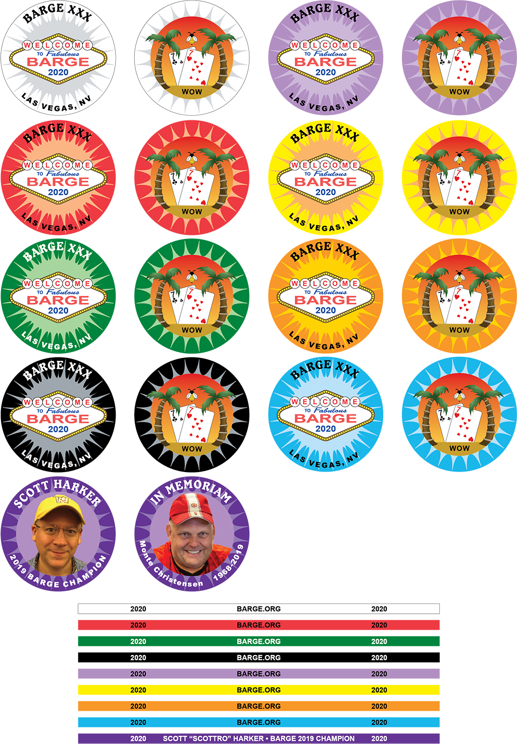 I am obsessed with palm trees, so I wanted to have them on my chips. I love the desert sunset and I wanted to incorporate the sevens in there to replace the sun, with rays of light behind them. […] I wanted to keep the common reverse classic BARGE, so I incorporated some ideas from past sets. I really like the sunburst design from the 2005 chips[.]