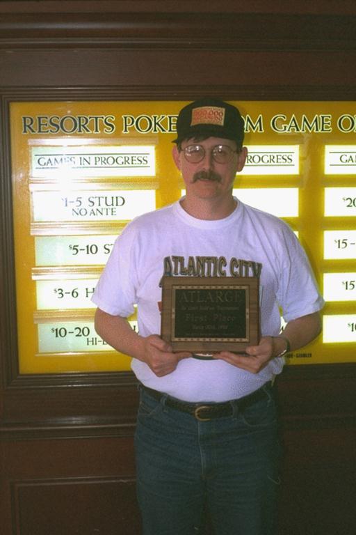 I had planned to take the train up Friday, to get some medium limit holdem in before the tournament, but was held up at a conference. So, drove up Saturday morning. I had an unusual room sharing arrangement - Robert Jacobs had Friday night and I had Saturday. Got in about 9 AM (left DC at 5:30), and when I tried to check in, the clerk was a little dubious, since she knew Mr. Jacobs was in the room. She asked me if I knew him, and I had to confess not personally, but after explaining the tournament situation all was ok. Left my bags in the room and headed down to the tournament area. The only person in the ATLARGE group I had previously met is Eric Holtman. Saw him there and met several others, including Jazbo. My immediate impression of the group was positive, at least partially because I wasn't the oldest fart in the group (probably close though). Tournament was fairly uneventful - I stole a few blinds, but never did really play a big pot, due to lack of appropriate cards. Finally with about T300 I had the big blind, with the blinds at 50 and 100 and R. Sooey had SB. As someone else has already noted, Richard was playing some fairly creative hands, and when he hesitated before calling my BB, I read him for a fairly weak hand. I had an A x unsuited, and decided to try to push him off, with the thought that I probably had the best hand if he called. He did call with Q 6 off, but unfortunately a Q came on the turn and I was out in (I think) 25th place. Not really a very solid play on my part, but what the hell - I really came up for the ring games anyway (or so I told myself). In spite of what Nolan (Darkside) Dalla thinks, I had never been to AC to play poker (and hadn't been there at all in ten years). Several of my poker compadres from DC/Maryland rave about the action at Taj Mahal, so I hied on over there (must have been about 1PM). Pretty dead - no 30-60, one 20-40 (full with a ton of folks waiting), one 15-30 (ditto), and not much else that looked interesting. Turns out I hit the room while a game I would have played in was on hiatus (more about it later). I saw a couple of acquaintances at the 15-30 table, and shot the shit briefly, ate lunch, and went back to Resorts for pot limit. Game kicked off about 4pm. I played straight through until 7AM Sunday, hitting a few hands and making a reasonable profit. Unfortunately two of the good hands I hit came against Jazbo - I almost hated to take his money because (A) he seems like a good guy and (B) he did such a super job of organizing the event, the tournaments and the pot limit games. But, you take the acorns where you find them, and I think Jazbo ended up doing ok in spite of these two beats. Even though I never really did get on any rushes, I truly enjoyed the game. Pot limit is my favorite game, and this was a good one, albeit a comparatively small game due to the blinds (1 and 2) and mandatory $5 bringin. Some very good players (Nolan and Bozo stand out in my mind as strong pot limit players, and there were several others). The dealers did a real good job, particularly seeing they had no experience with PL. Perhaps the best thing was the atmosphere provided by the ATLARGE group- no whining, no yelling at the dealer or throwing cards, and a generally convivial scene. The only (relatively minor) irritant was a local known as the Mad Russian (Sergei, I think) who complained about the format and his hands constantly while chain smoking without pause. He no doubt considers himself a good player, but he had very little shot in this game, since it was clear he planned to play nothing but the nuts, and it was easy for everyone to push him out of hands. Given the generally positive vibes at the table, he was really more of a source of amusement than a real downer. About 7 in the morning I finally decided I had better get some sleep when I had KK and called two reasonable bets (total of about $200) when I was sure Warren had AA. Sure enough, and the K didn't come (what a surprise). I figured that was a bad enough play that my judgement was getting questionable, and a break was in order. We were getting shorthanded at that point (about 5 players left) so I walked over to Taj to see if I could see any likely replacements for me. Found two folks who would have been welcomed, but who were uneasy about pot limit. Also found a couple of my regular opponents in DC playing 75-150 half holdem half omaha. This is a game I would liked to have known about earlier, because there were a couple of real contributors in the game, which had been running since Friday almost continously (they had all gone to lunch when I had come over Saturday afternoon). Both of my friends did real well (though one was stuck about seven thousand at one point, he made a nice comeback and got some cheese). They all looked so burned out I thought about getting in, but I remembered my KK misplay, and decided I wasn't in much better shape. Then I watched a short handed 400-800 stud game for a while. Five players while I was there, three real good and two that looked a little marginal. I might have been tempted if I had brought 20 or 30 thousand (and had had some sleep). I later heard one of the good players scored over 100 thousand in the game. Finally did get about two hours sleep, and came back down to watch a little of the ATLARGE 7 stud tourney (and maybe play some more PL). Unfortunately (or fortunately) the PL was full, and stayed full until I needed to leave (about 2PM). Nolan needed a ride back to DC, so he and I headed on back; I was very glad to have the company, and had a great time talking poker with a strong pot limit player (and a good poker writer). All in all a most satisfying weekend - the ATLARGE crowd impressed me as boon companions all, and Jazbo (to reiterate) did a superb job of organizing everything and keeping the games moving smoothly. The Resorts poker room staff were great, and the hotel was fine (and a good bargain at the poker rate Jazbo negotiated). All 